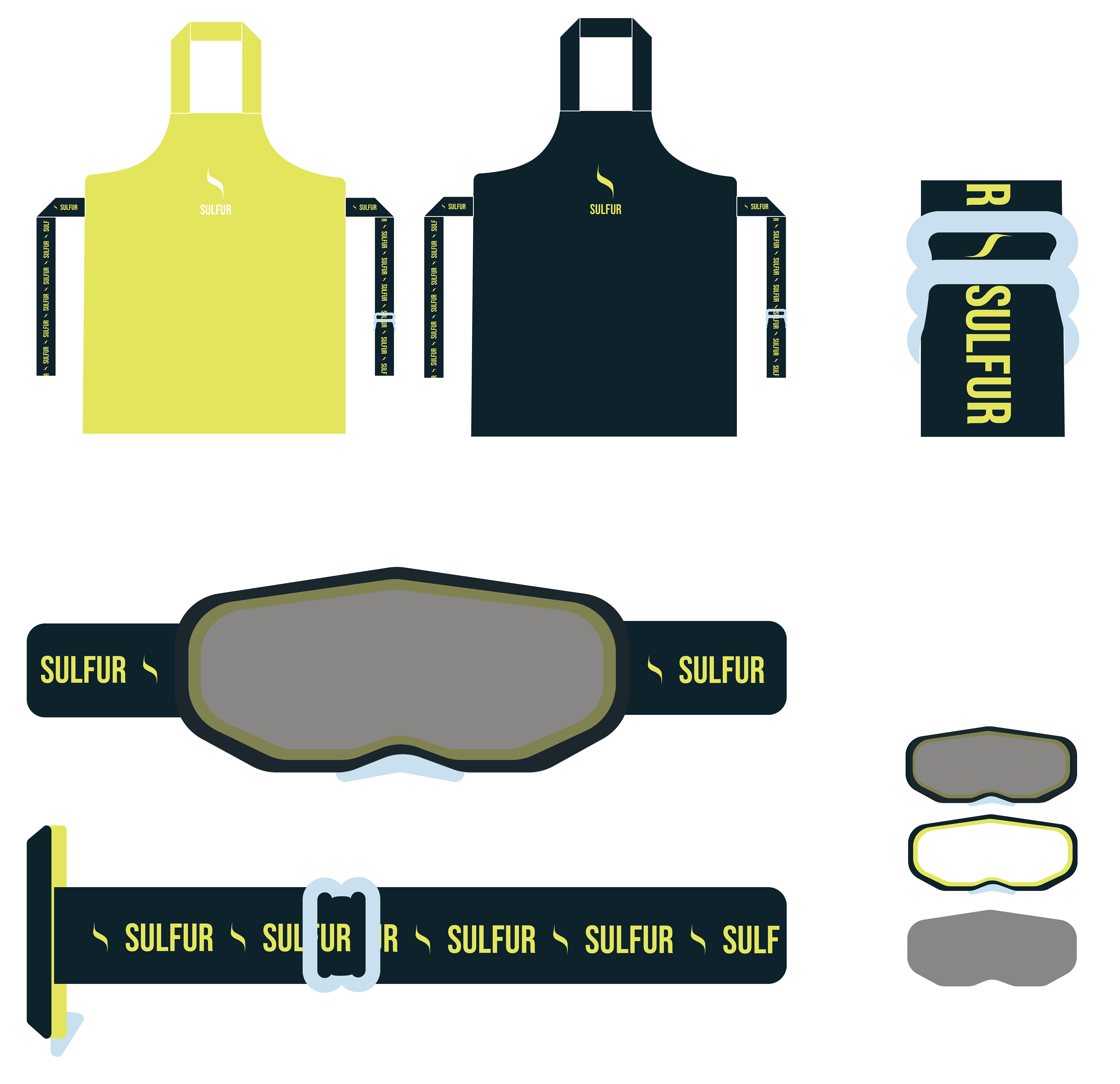 When handling sulfur, PPE such as goggles and aprons are required to reduce the risk of burns or contamination. We explored the application of Sulfur's visual identity on usable merchandise.