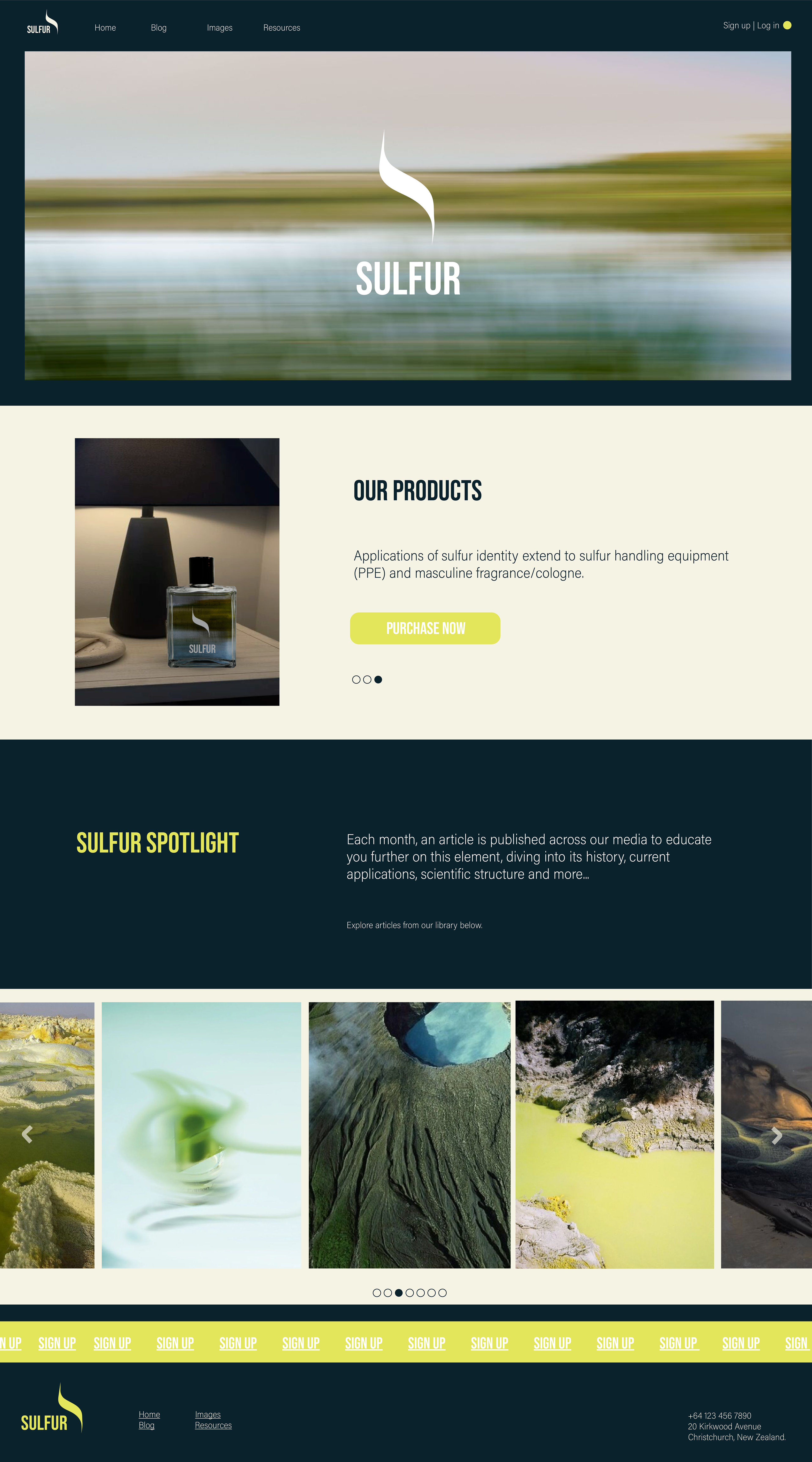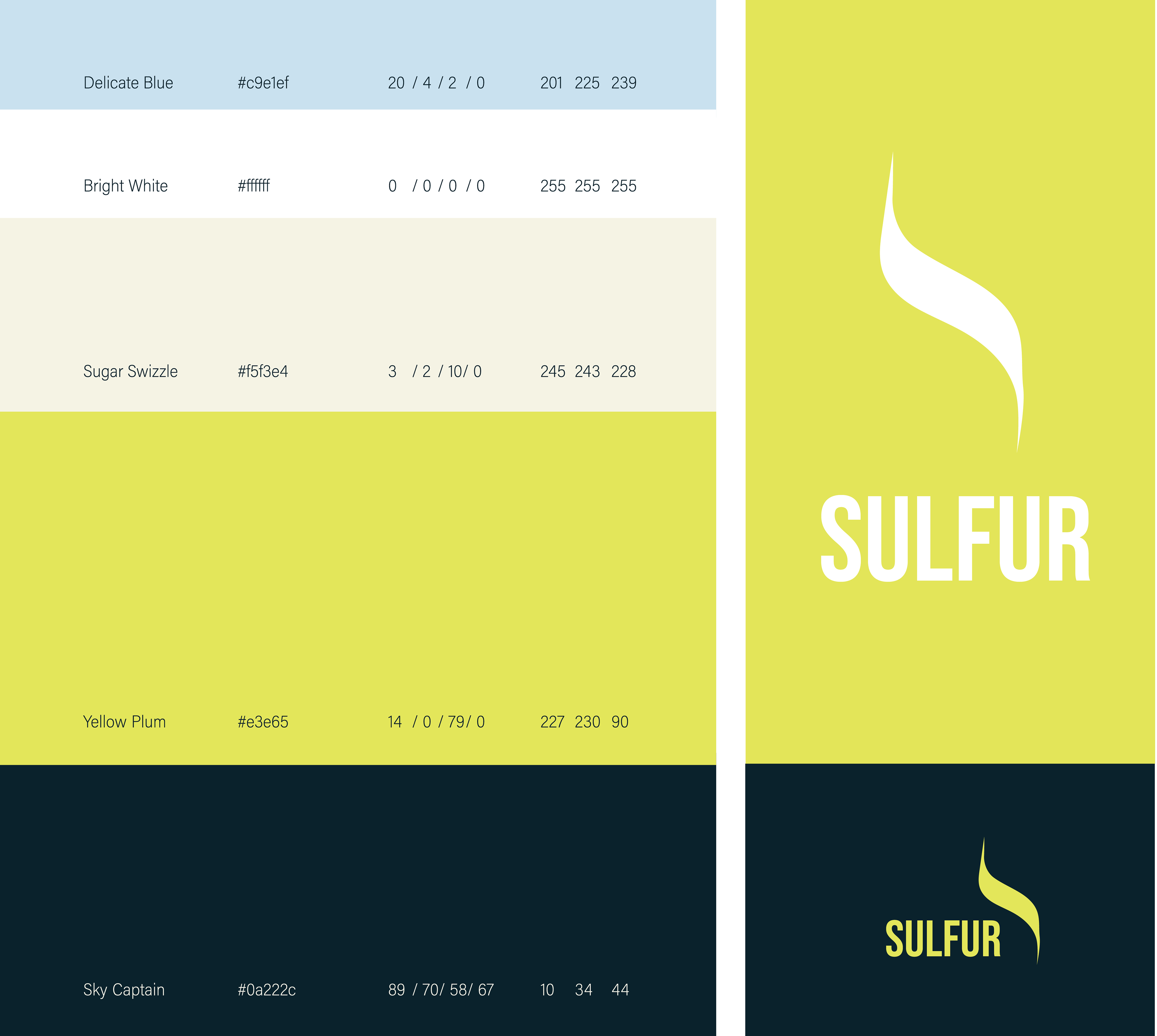 This visual identity was heavily inspired by the strong potency of the element sulfur. The logomark represents rising vapour and flammability while the wordmark was designed to communicate strength with its rigidity and cleanliness.